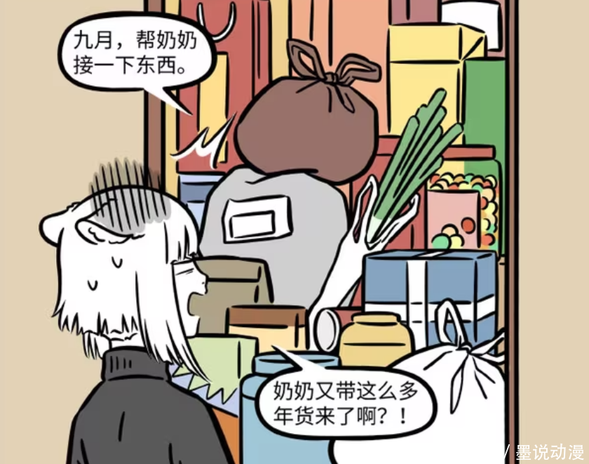 惦念什么来什么,九月就这样被埋在年货内部。十一月笑脸招待奶奶,此时奶奶的形象出现,外形等于九尾狐,不外衣服等于东说念主类老奶奶的衣服。奶奶还在找九月,不知说念她的孙女还在这堆年货内部。