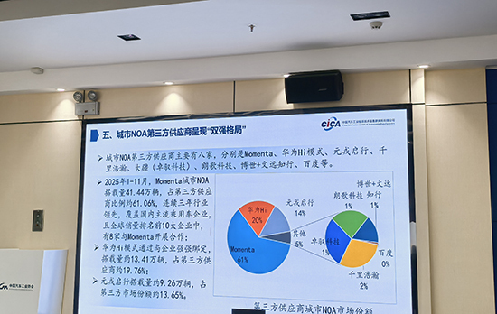 这其中,第三方城市NOA供应商市集呈现“双强主导”面容,Momenta和华为的市集份额诡计占比约好像。2025年1—11月,Momenta城市NOA搭载量41.44万辆,占第三方供应商比例约61.06%,隐敝国内主流乘用车企业;华为HI花式搭载量约13.41万辆,占比第三方供应商约19.76%。