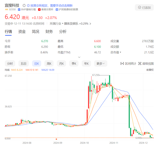 手脚老牌互联网公司,宜搜科技是2024年6月7日登陆港交所的,那时刊行价为5.80港元/股,全部上升后,在10月29日股价达到了最岑岭67.25港元/股。