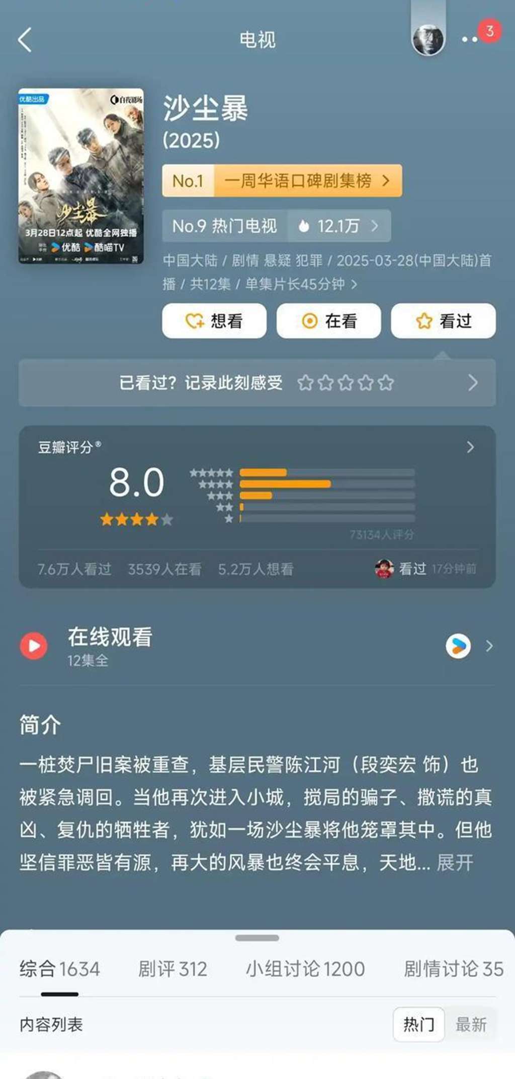 段奕宏、王锵、张佳宁主演的《沙尘暴》,皆备是本年悬疑剧里的一匹黑马。这剧开分高达8.1分,目下踏实在8.0分,是本年已播悬疑剧里评分最高的。