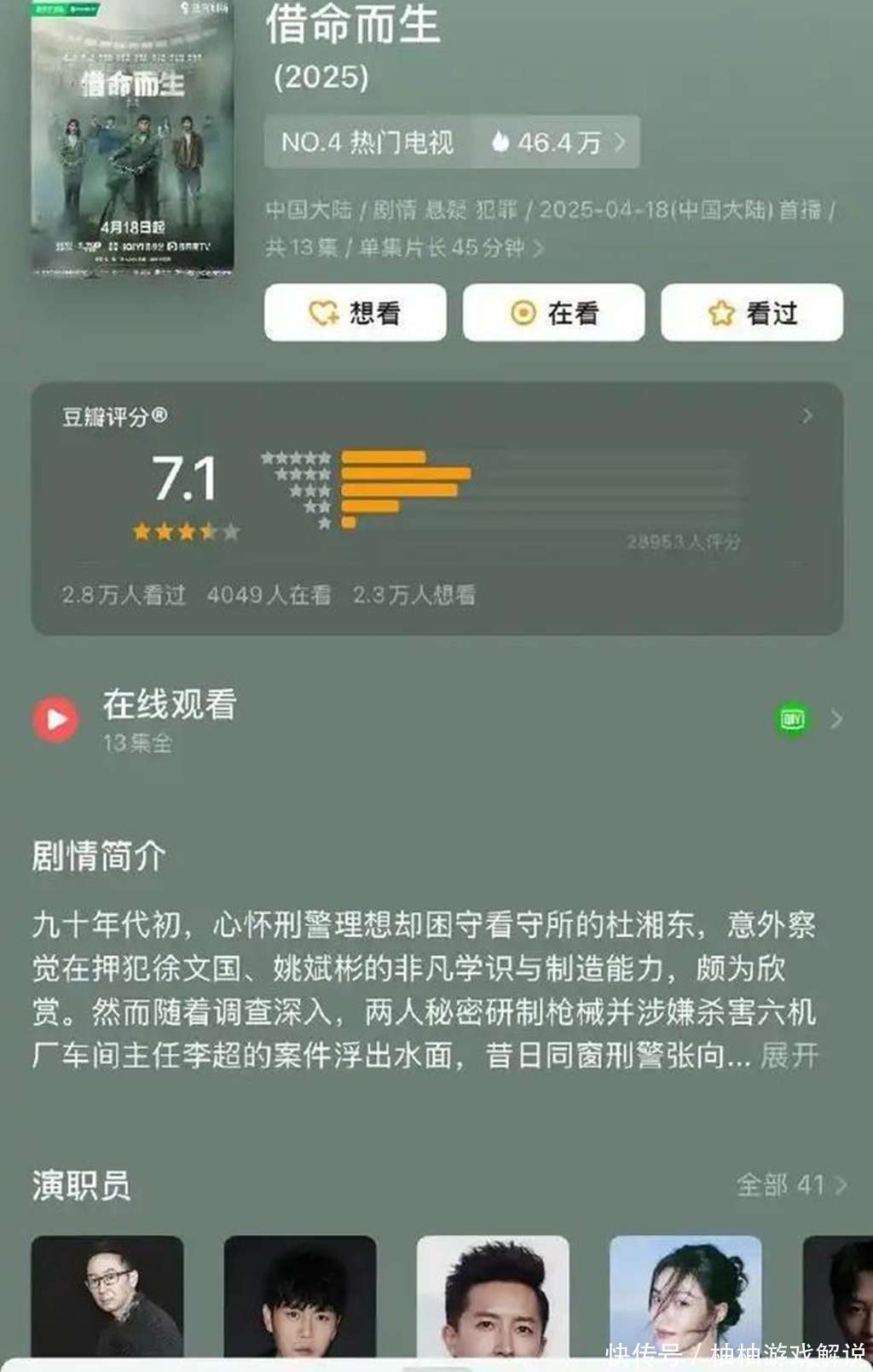秦昊、韩庚主演的《借命而生》,开分亦然7.1。这剧啊,讲的是狱警和逃犯之间长达20年的追逃故事,布景是国企改制、下岗潮,很有期间感。