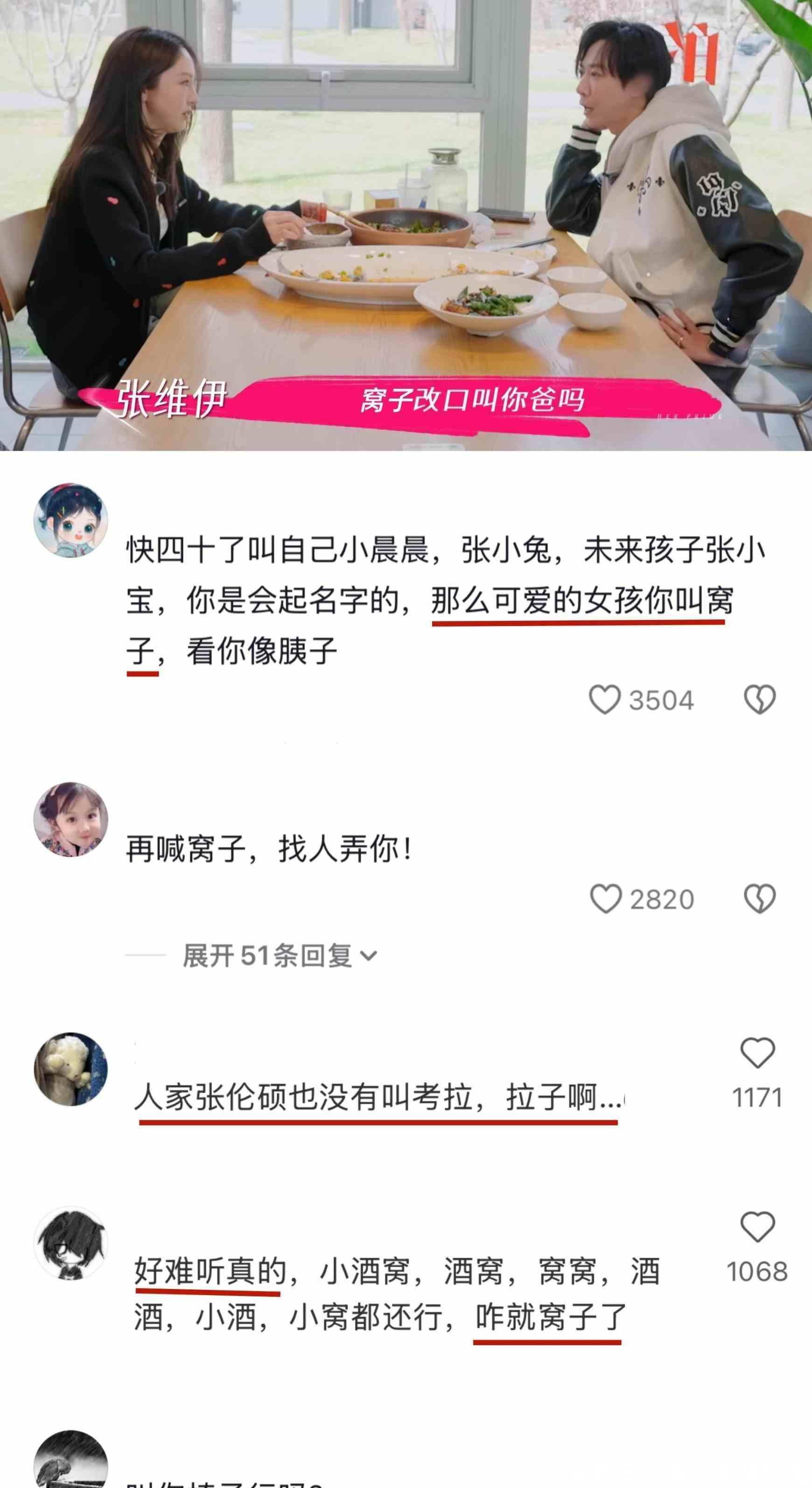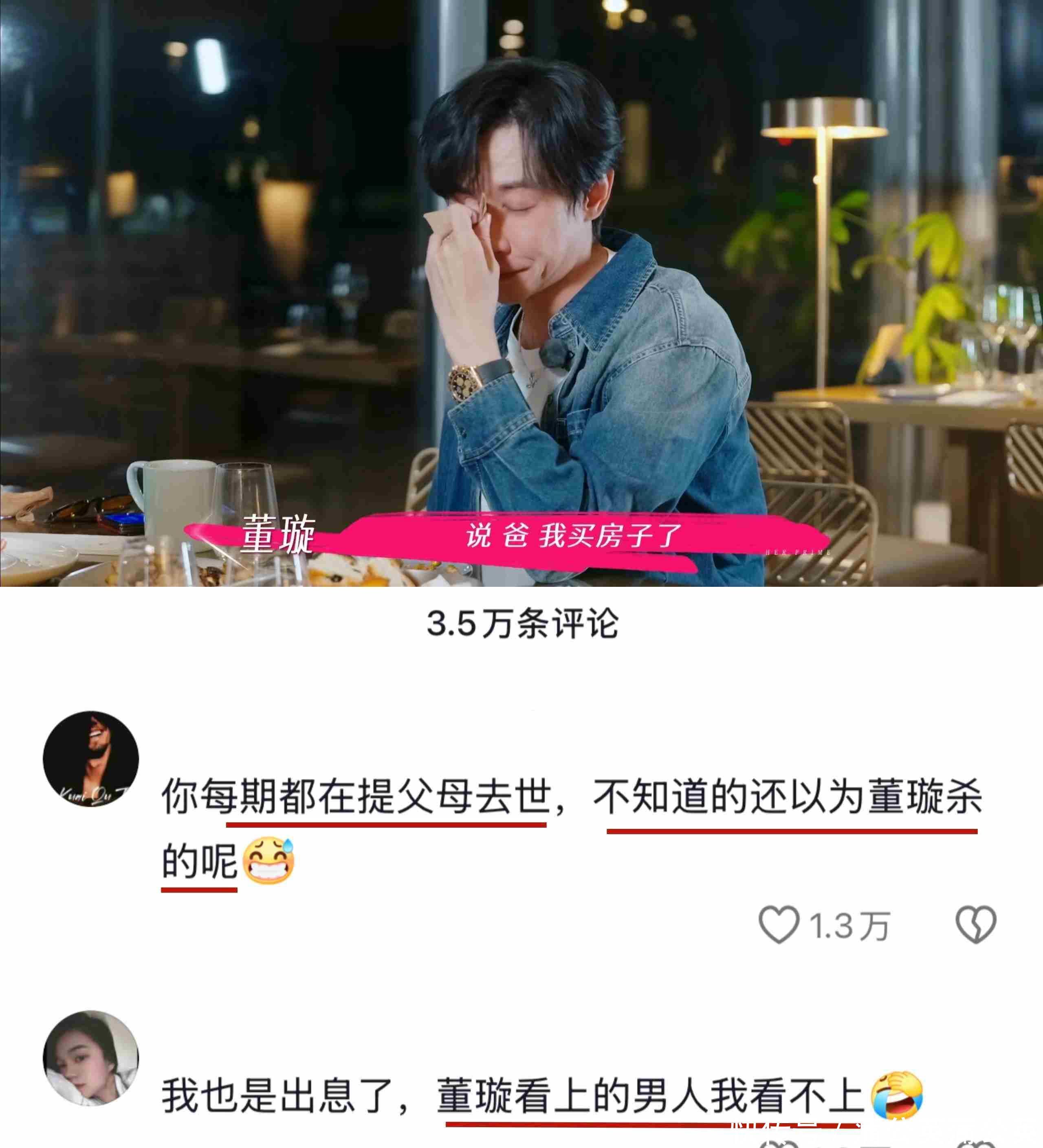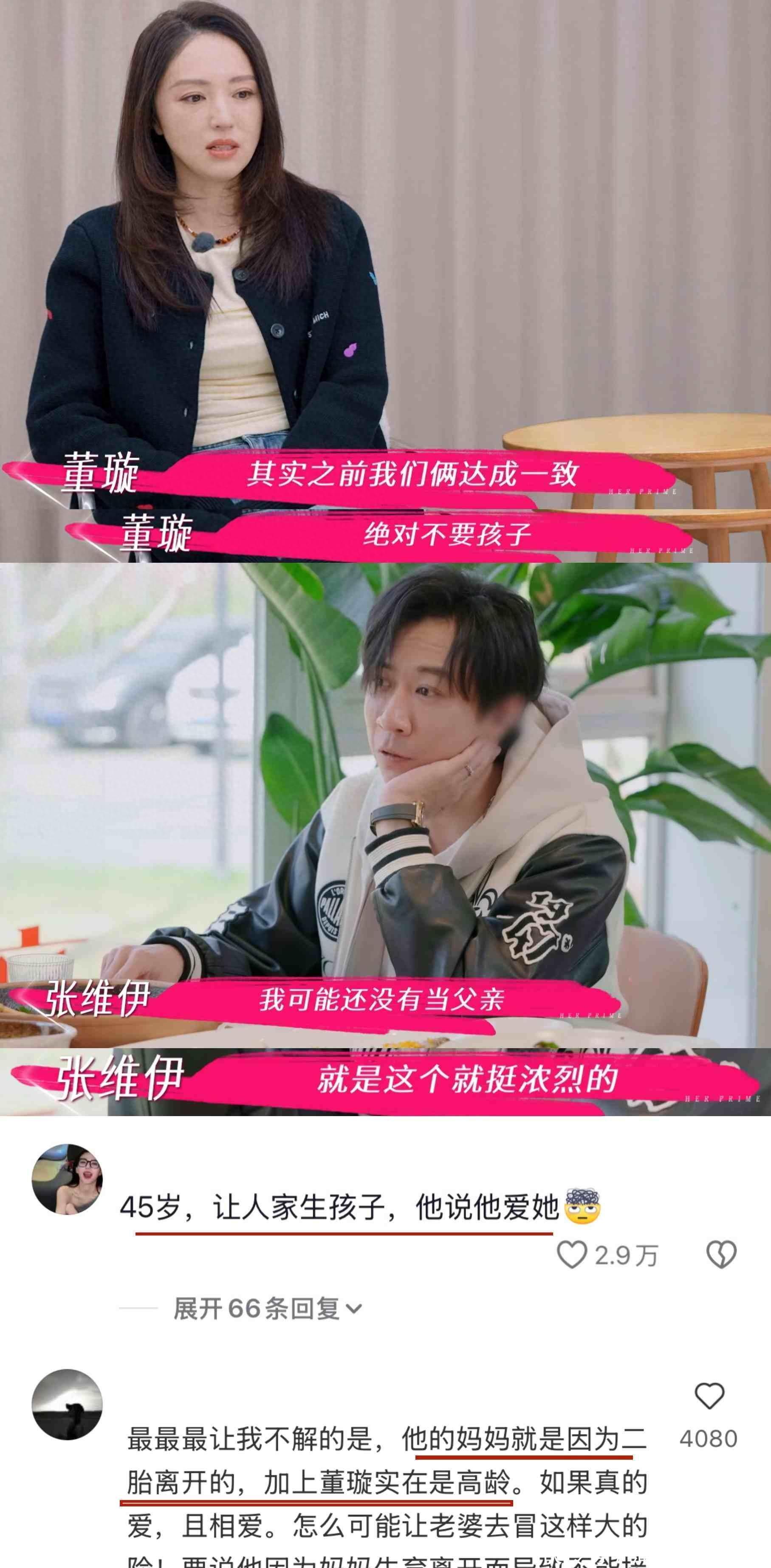 张维伊在节目里总提厌世的父母,一说就拿纸巾擦眼泪,搞得董璇十分痛苦。有东说念主以为他概况在示意董璇害死爸妈,研究区平直炸了。两东说念主婚前说好不要二胎,他当今却说不错生,还说要我方带孩子。网友问:“45岁了还让妃耦生孩子,这算爱吗?”