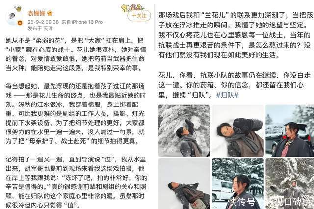 至于这场戏的成片成果怎么,袁姗姗的进展至关艰巨。她为了拍好这场戏也吃了不少苦头。她身上绑着配重反复入水,只为呈现出最佳的景象。胡军现场探班时暖心饱读吹谈:“冻坏了吧,拍的出奇好,你的浑沌是值得的。”这段经验让她联念念到实在历史中的抗联战士们,感喟现今好意思好生计的难得贵重。同期看成别称演员,她也为能在影视剧中饰演别称抗联战士而感到侥幸。幸亏正片里“冰河护子,战士赴死”让多数不雅众泪目。