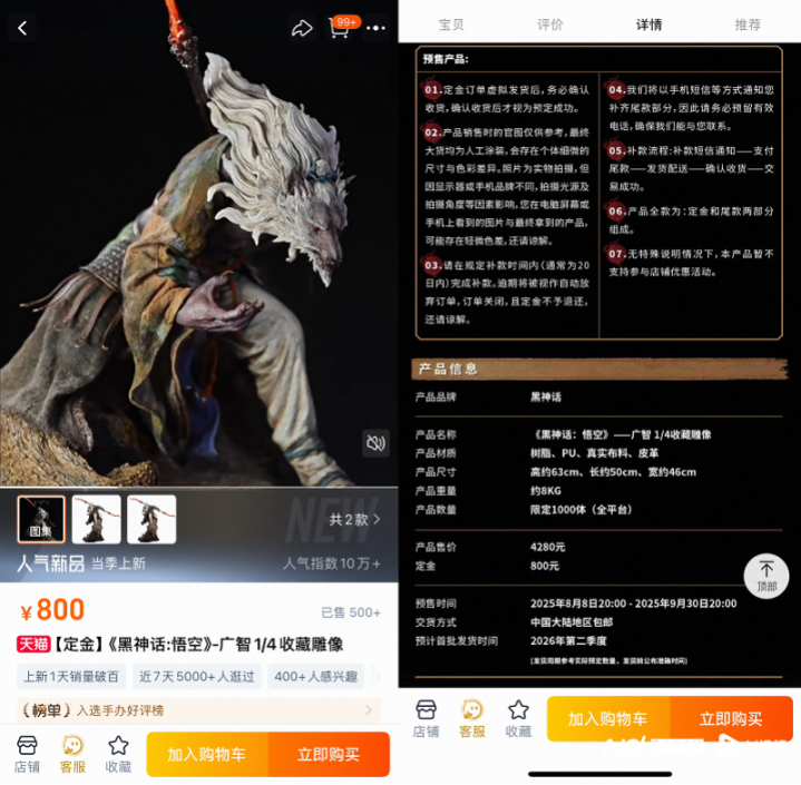 当今,黑神话BLACKMYTH的首批产物已在天猫、京东的黑神话官方旗舰店和名创优品部分线下联结店铺上架。当今线上店铺已推出泥像、服装、玩偶、配饰、家居等多类产物,产物价钱为19-499不等。近期,该店铺还推出了《黑神话:悟空》广智、夜叉王、金池长老、阴魂四个变装的1/4保藏雕像,其中广智售价为4280元,定金800元,抑制在全平台将卖1000体,当今在天猫旗舰店中已售出500+,京东自营店售出185件,瞻望首批发货时刻在2026年第二季度。