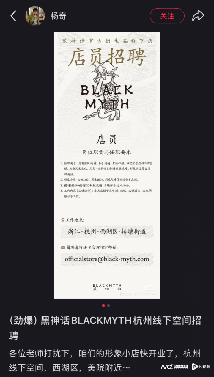 9月4日,游戏科学延续创举东说念主、《黑神话:悟空》好意思术总监杨奇在酬酢平台发布招聘公告,称黑神话官方繁衍品线下店将在杭州西湖区开业,当今正在招聘伙计和店长。左证招聘信息,该线下空间位于杭州市西湖区转塘街说念体育游戏app平台,与游戏科学杭州团队处所地毗邻。这次招聘岗亭包括店长与伙计,责任实践涵盖店铺平素运营、货物惩处、主顾就业、试衣间爱护及收银等。