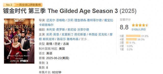 《镀金时期》第三季前几天收官了。豆瓣评分也出来了,8.8。我原以为会上9分的,差小数,还行。下一季再冲。