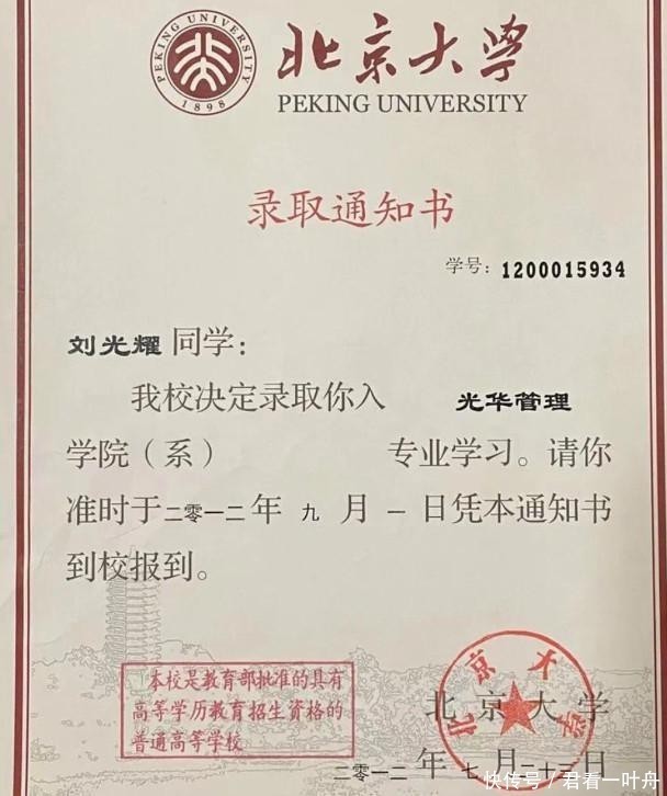 比及了2012年,刘光耀更是一鸣惊东谈主,他莫得成为我方梦念念中的山东省高考状元,然而他也不差,是通盘淄博的高考状元。群星妍丽中,他亦然最细心的一颗,是通盘山东高考的榜眼,径直拿到了北京大学的登第告知书,顺利插足了北大光华管束学院。