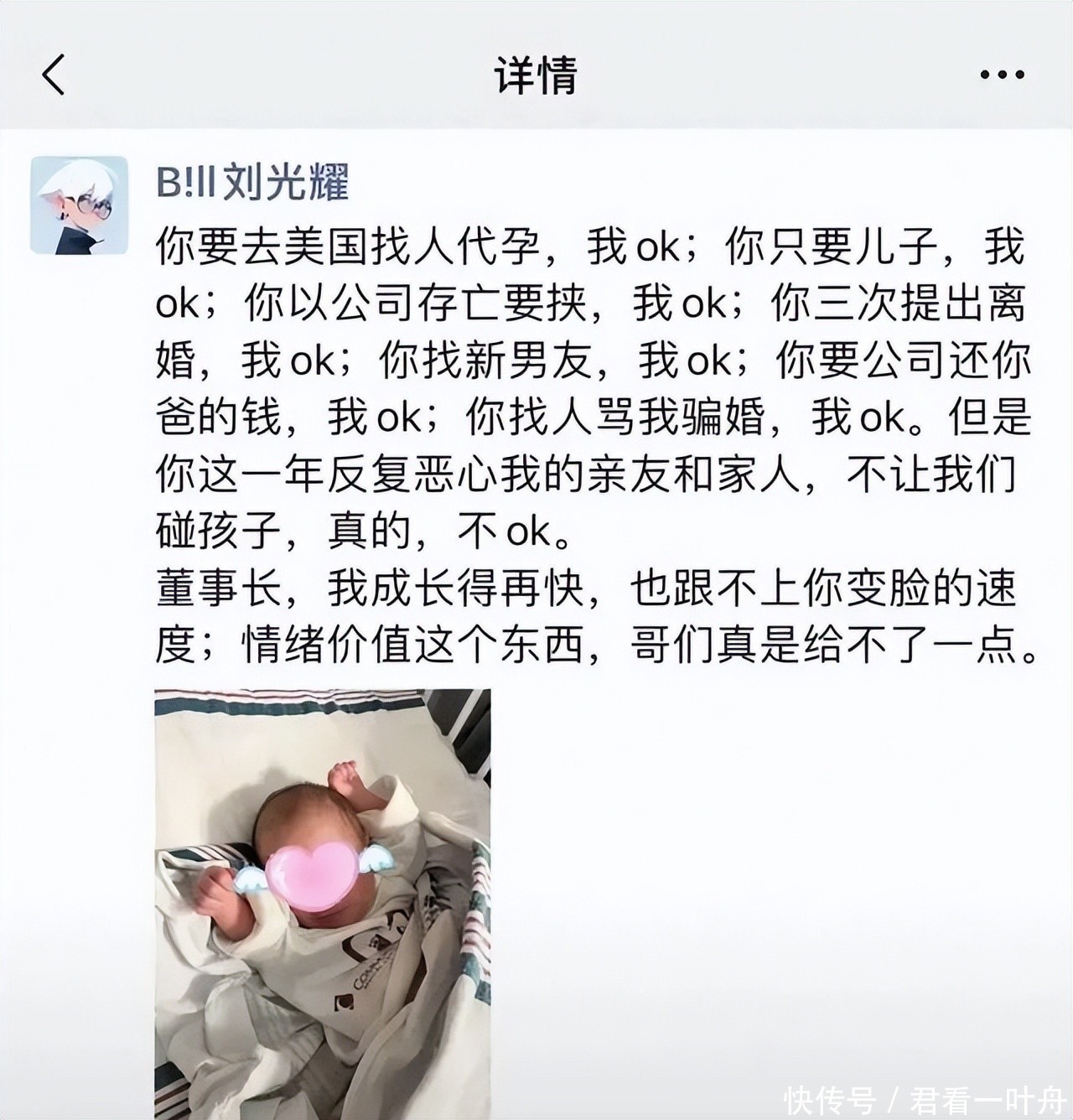 话说到这份上,两边其实照旧和仇东谈主没什么分裂了,终末皆是一地鸡毛,刘光耀说我方照旧失去了公司的掌控权,失去了CEO的宝座体育游戏app平台,安吉说因为丈夫的不调解,当今他们的孩子还淹留在好意思国回不来,一言以蔽之,权门恩仇走到这一步,竟然只剩一地狗血,令东谈主十分唏嘘。