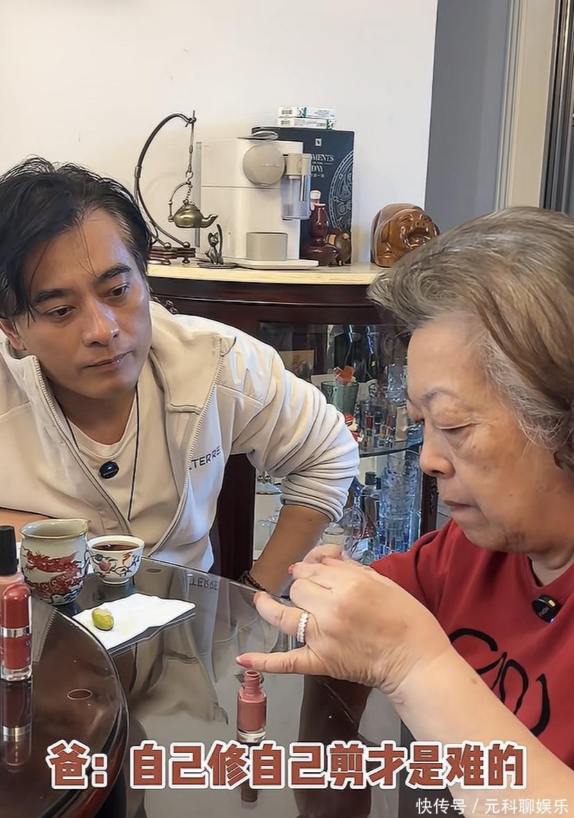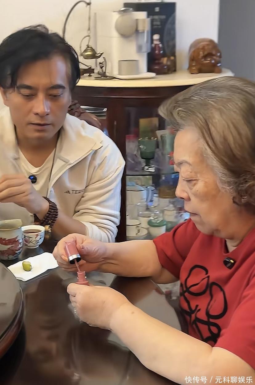 陈龙姆妈涂指甲油,他在一旁跑了一壶茶。边喝茶、边看着姆妈涂指甲,往往时的对着母亲夸赞几句。
