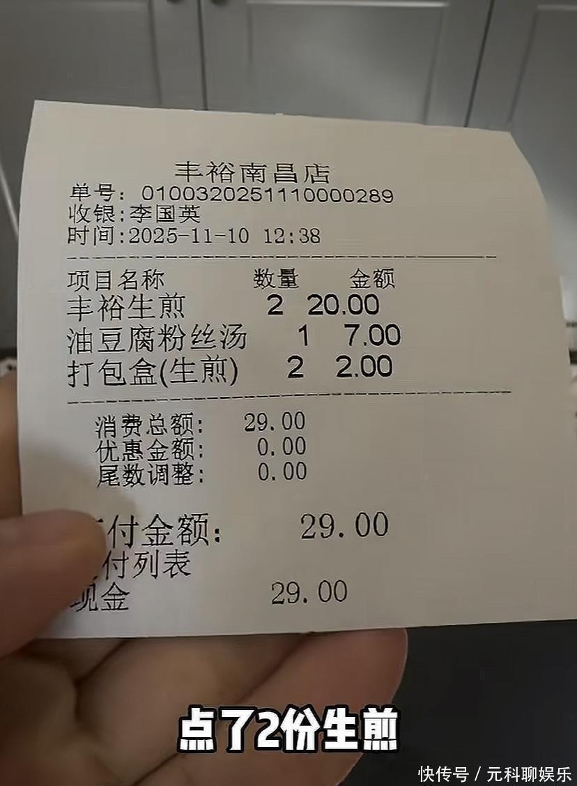 陈龙是纯正的上海土著,是以很是可爱吃生煎、也可爱粉丝汤。他点了2分生煎、一份油豆腐粉丝汤,加上打包盒一共花了29元。