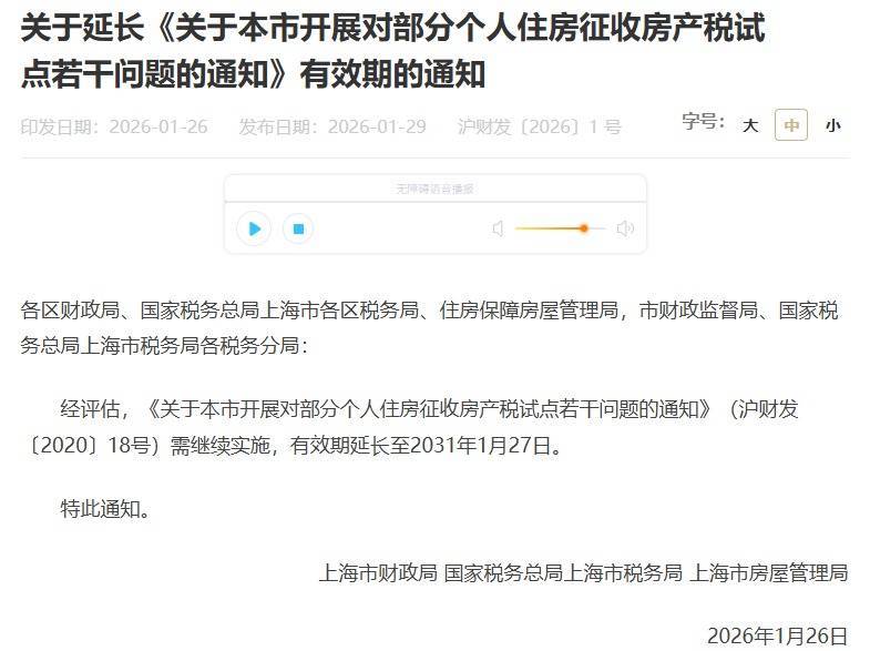 【大河财立方音尘】1月29日,上海市财政局、国度税务总局上海市税务局、上海市房屋搞定局发布示知,《对于本市开展对部分个东谈主住房征收房产税试点几许问题的示知》(沪财发〔2020〕18号)需络续实施欧洲杯体育,灵验期蔓延至2031年1月27日。
