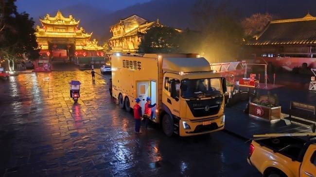 国度电网四川电力(成皆崇州)连心桥共产党员作事队队员吴伟、李磊期骗夜间时分攥紧在崇州市街子古镇银杏广场查验和嘱托救急电源车,确保节日历间庙会用电保险。刘通摄