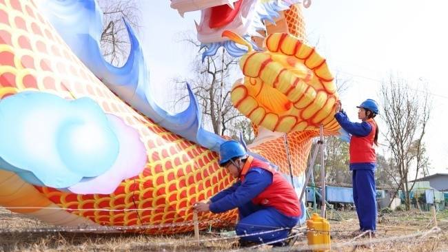 国网四川电力(成皆温江)连心桥共产党员作事队队员李泊江、吴雨泉在温江熊猫仙侠千灯城现场协助垄断方查验临时廓清的设施与安全,确保灯会用电安全无忧。刘莞义摄