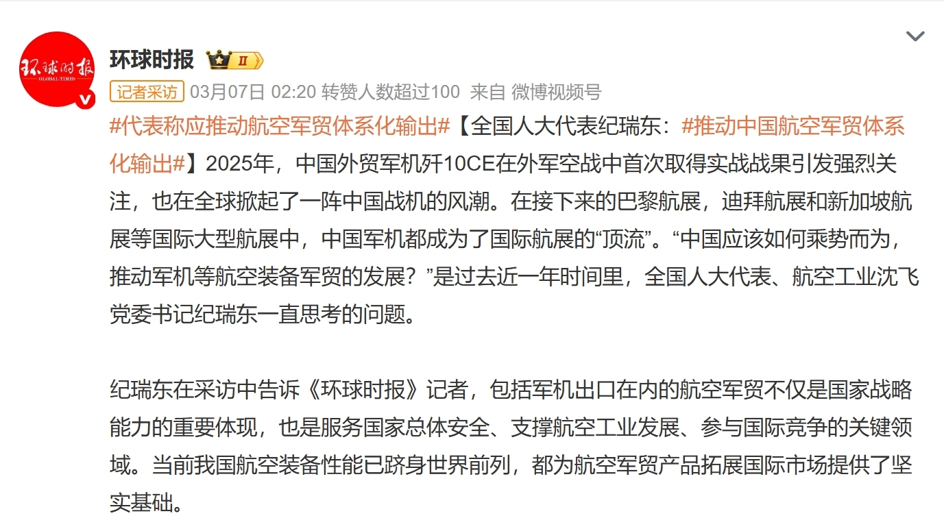 另据《中国航空报》3月10日和《环球时报》3月7日的报说念称,“两会”手艺,寰宇东说念主大代表、航空工业沈飞党委通知、董事长纪瑞东带来的提案(《鼓动航空装备军贸高质地发展的提议》)中枢提议是“成体系的扩大航空军贸的国际出口规模”。