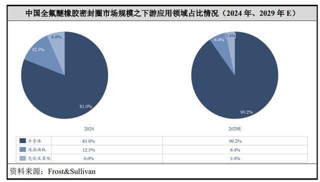 字据弗若斯特沙利文统计,2024年度中国全氟醚橡胶密封圈阛阓边界为70.10亿元,其中运用于半导体边界的阛阓边界为56.80亿元、占比81.00%、排行第一。跟着行业运用的不断增长,半导体级全氟醚橡胶密封圈阛阓边界占比将由2024年度81.00%增长至2029年度90.20%,成为全氟醚橡胶密封圈阛阓的最弥留构成部分。