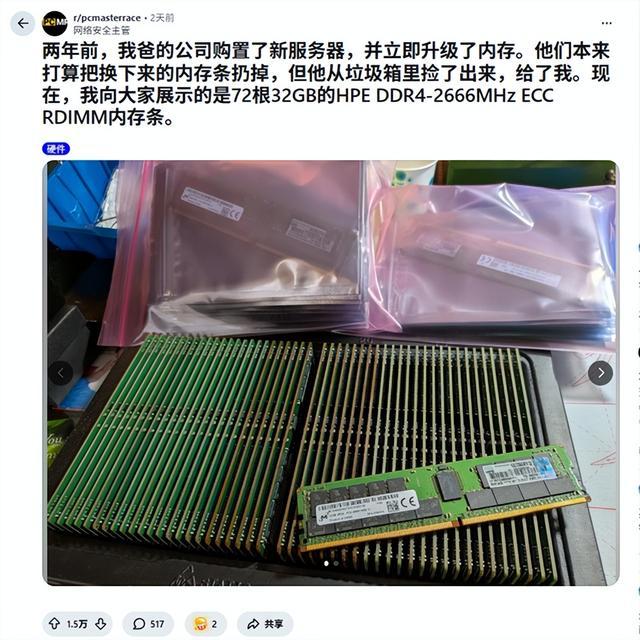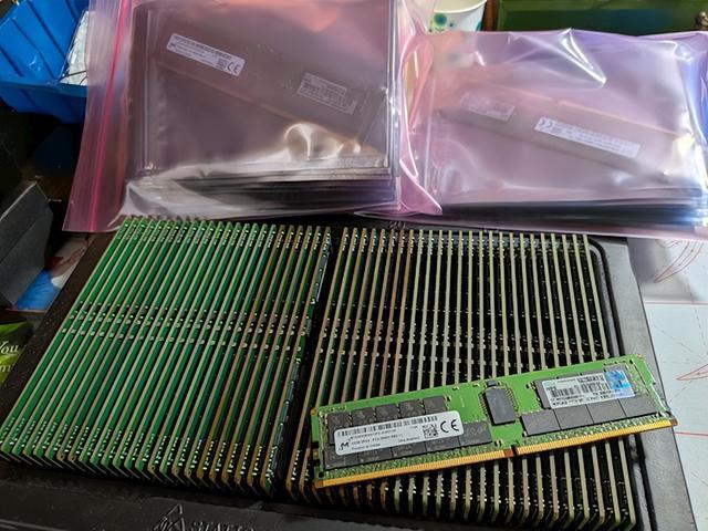 Reddit PC硬件社区r/pcmasterrace的网友cyberchief发帖称:“2 年前(2024年),我爸的公司买了新工作器,得手坐窝就升级了内存。换下来的原厂内存条原来要被丢进垃圾桶,我爸把它们从垃圾堆里救了总结,交给了我。给人人望望,72条HPE 32GB DDR4-2666MHz ECC RDIMM内存。”