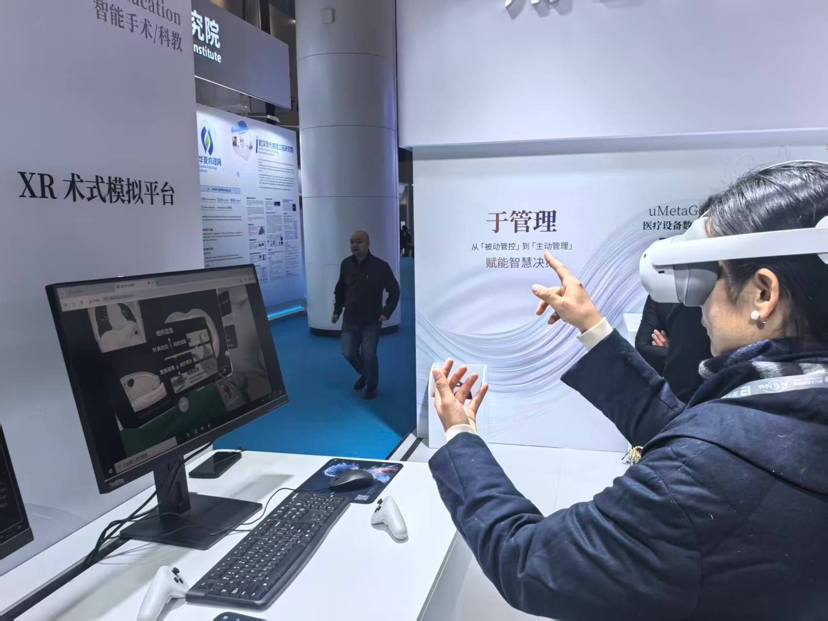 在联影智能展台,一位不雅众正通过VR开拓,在XR手术模拟平台上体验肺穿刺操作。“肺部结构、骨骼、血管齐看得一清二楚,就像在玩一款高精度VR游戏。”体验者惊奇。责任主说念主员先容,这套系统不仅能用于大夫培训,还能收尾群众良友实时领导,让手术学习更安全、直不雅。