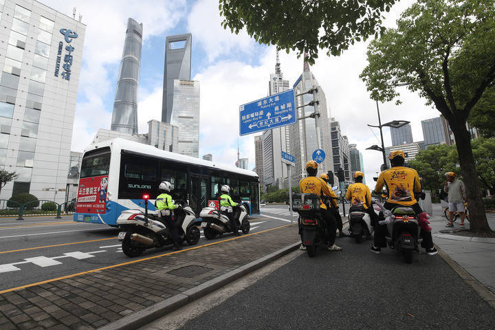 7月20日,在上海市浦东新区浦东南路上,外卖骑手在输送快递途中恭候红绿灯。而在傍晚技艺,城市的物流集中又忙绿了起来。在上海市静安区恒隆广场隔邻,外卖骑手小李的储物箱内同期装着三份订单:一份是写字楼白领点的晚餐,一份是药店的急送药品,还有一份是讼师事务所的加急文献,“当今非餐订单越来越多,能占到三成摆布。”他说。