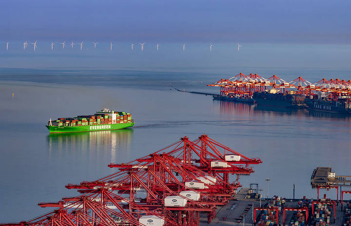 黎明六点,上海洋山港四期自动化船埠,AGV(全自动无东谈主诱掖车)上一只红色集装箱伴着霞光移动,经过桥吊辛勤操作被稳稳执起,精确吊装搬运到远洋班轮的船面上。这个民众单体鸿沟最大、智能化进度最高的全自动化集装箱船埠,24小时不阻隔功课,一个日夜的微辞量可超27000尺度箱。